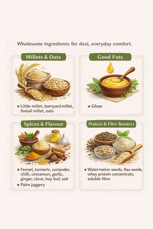 The millets are pre-soaked and gently cooked before drying—a traditional step that makes them easier to digest and quicker to prepare. So you get the depth of slow-cooked food in a bowl that’s ready in minutes.