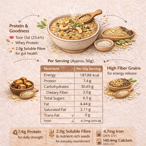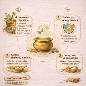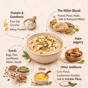 Our Palm Jaggery and Coconut Millet Porridge is thoughtfully formulated to provide a nourishing and well-balanced meal option. Millets, renowned for their high fiber content and essential nutrients, offer sustained energy and promote digestion—a perfect addition to your busy, on-the-go lifestyle. The inclusion of palm jaggery, a natural sweetener packed with iron and antioxidants, enhances the taste profile while serving as a healthier alternative to refined sugars. To elevate the experience, we infuse the creamy richness of coconut, delivering both a tropical flair and an array of additional health benefits. Health meets convenience in just 5 minutes. Whether you're kickstarting your morning with a comforting breakfast or indulging in a guilt-free dessert, our Palm Jaggery and Coconut Millet Porridge caters to your immediate cravings and long-term well-being. Satisfying, ready-to-cook, and perfectly balanced.