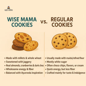 Each cookie is baked with millets (jowar, bajra, ragi), whole wheat flour, and jaggery instead of maida and refined sugar. Balanced with Ayurveda-inspired wisdom, they deliver sustained energy, wholesome fiber, and mindful indulgence without compromise.